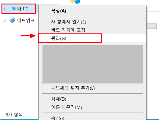 내PC 위에 오른쪽 마우스 클릭하여 [관리]를 선택