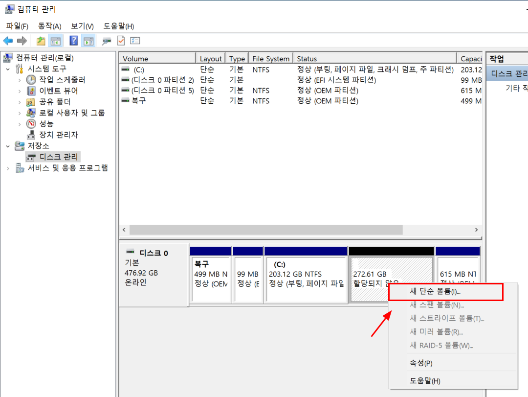 19. 할당되지 않은 공간 위에 오른쪽 마우스 클릭하여 [새 단순 볼륨]을 클릭
