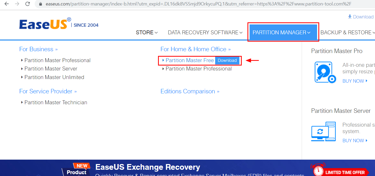 EaseUS 에는 다른 프로그램들도 있기에, 메뉴 PARTITION MANAGER 를 클릭하자.