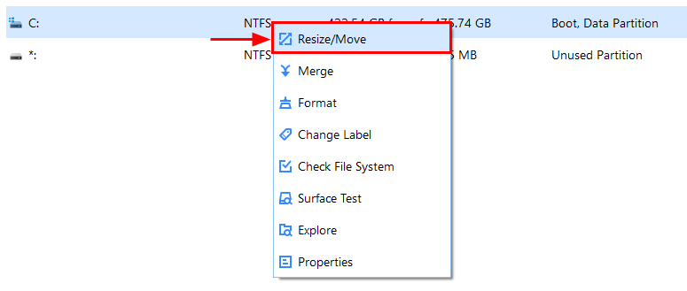 10. C드라이브 위에서 오른쪽 마우스를 누르면... [Resize/Move] 클릭하자.