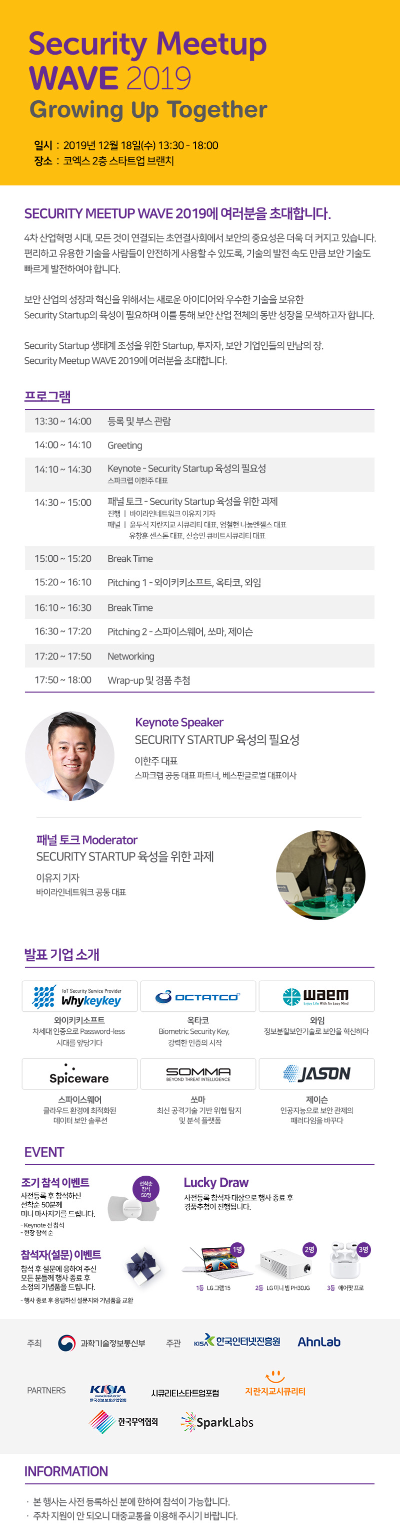 Security Meetup WAVE 2019에 여러분을초대합니다. 4차 산업혁명 시대, 모든 것이 연결되는 초연결사회에서 보안의 중요성은 더욱 더 커지고 있습니다. 편리하고 유용한 기술을 사람들이 안전하게 사용할 수 있도록, 기술의 발전 속도 만큼 보안 기술도 빠르게 발전하여야 합니다. 보안 산업의 성장과 혁신을 위해서는 새로운 아이디어와 우수한 기술을 보유한 Security Startup의 육성이 필요하며 이를 통해 보안 산업 전체의 동반 성장을 모색