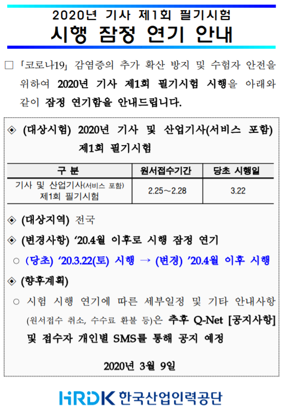 코로나19 감염증의 추가 확산 방지 및 수험자 안전을 위하여 큐넷 2020년 기사 제1회 필기시험 시행을 아래와 같이 잠정 연기함을 안내드립니다.