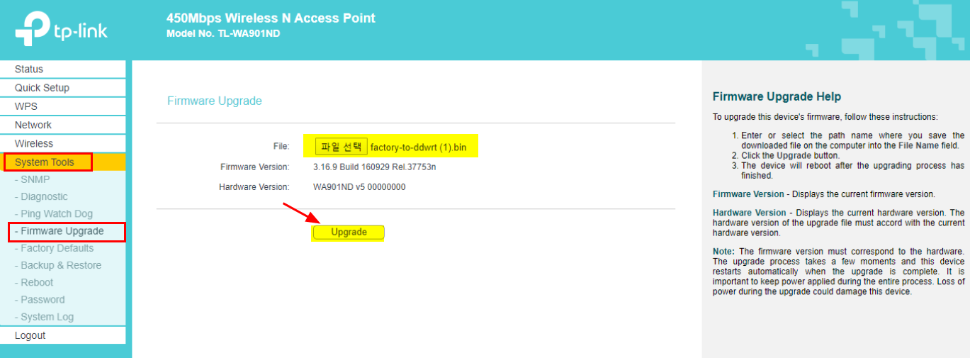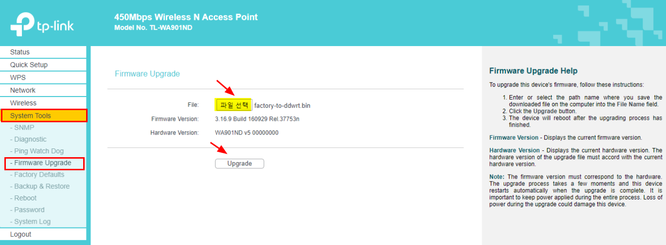 6. 왼쪽 메뉴 SYSTEM Tools - Firmware Upgrade 로 선택해 들어가자.