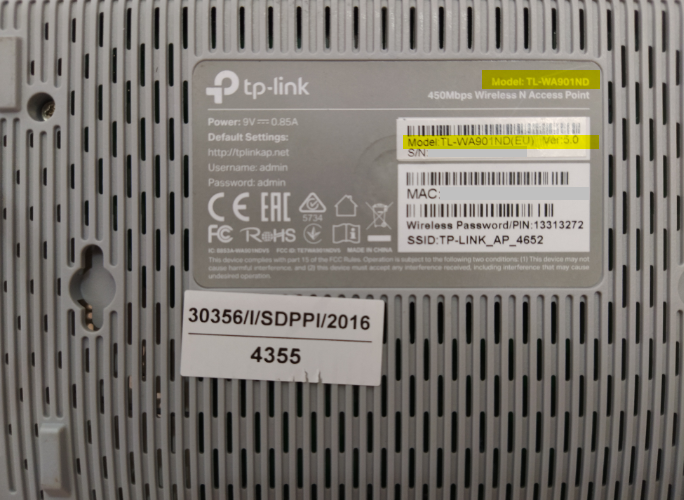 기기 뒷면을 보니 MODEL : TL-WA901ND(EU) Ver : 5.0 이렇고 조금 위에는 모델이 TL-WA901ND 로 있다.