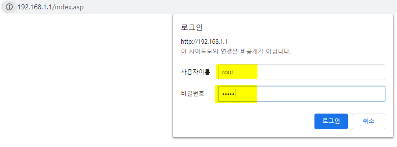 알맞게 라우터의 아이디, 비빌번호를 입력한다.