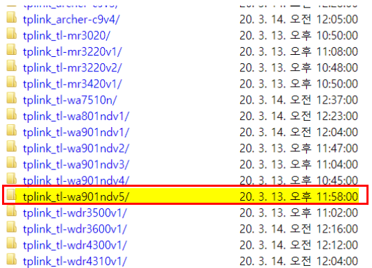 11. 최신 버전을 찍고 들어오면 다시 제조사 모델별로 쫙 폴더들이 존재한다. tplink tl-wa901ndv5 ..버전5도 폴더가 있다.