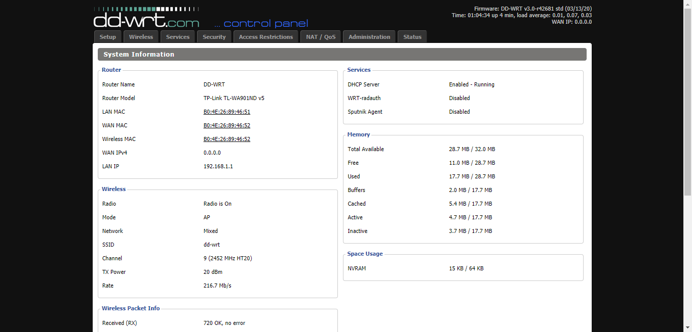 18. DD-WRT 관리자 화면이 나온다. 펌웨어가 업데이트 된 것이다.