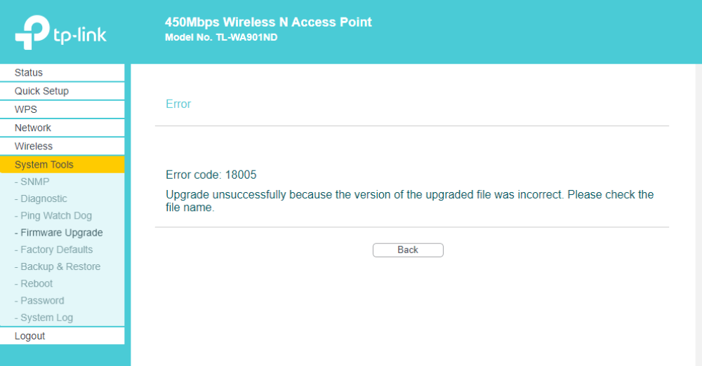 7. 엑~ Error code : 18005 펌웨어 파일이 잘못되었다는 메세지를 보여준다. 버전이 안 맞는 것인가?