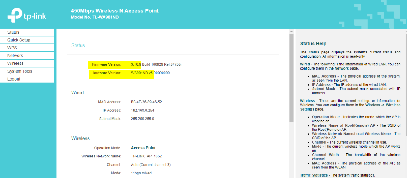 펌웨어 버전은 3.16.9, 하드웨어 버전은 WA901ND V5 로 나와있다.