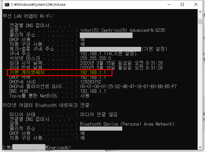 접속 후 ipconfig/all 명령어로 확인시 게이트웨이 IP가 192.168.1.1 로 나왔다.