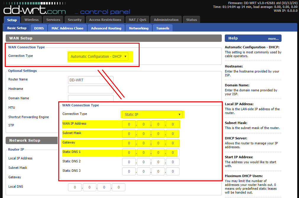 4. Setup - Basic Setup 에서 Wan Connection Type 은 공유기 기기 자체에 IP할당 설정을 의미한다.
