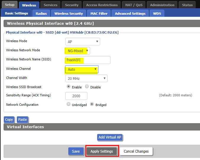 7. 똘82닷컴의 경우는 네트워크 모드(NG 만), WIFI SSID이름은 freeWIFI로, 채널은 자동으로 잡고 Apply Setting 클릭하였다.