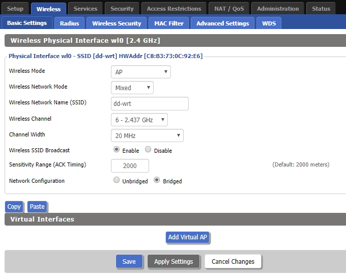 6. WIRELESS - BASIC SETTING 에서 WIFI 관련 핵심 설정을 해 준다.