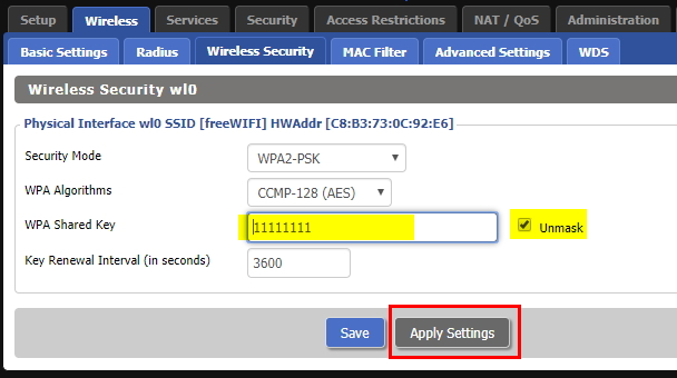 Apply Setting 을 클릭하면 또 접속이 끊어질 것이다. 암호를 설정했기 때문에 다시 wifi 암호 입력 후 접속하면 된다.
