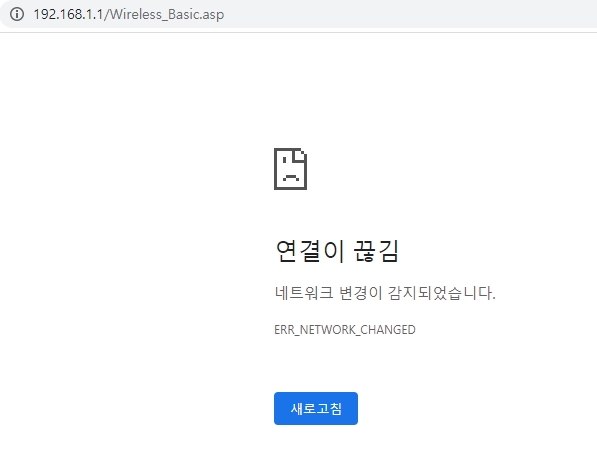 5. 다른 메뉴 진입시 이렇게 연결이 끊김 메세지가 나올 수도 있다. wifi 접속 상태인지 보고 연결 상태라면 다시 관리자 웹페에지 IP 192.168.1.1 을 입력해 주면 정상 접속이 될 것이다.
