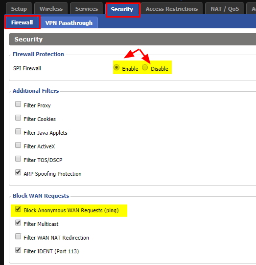 그리고 아래에 Block Anonymous Wan Requests (ping)에 체크가 되면 외부에서 유무선공유기 자체에 ping 테스트가 불가하다.