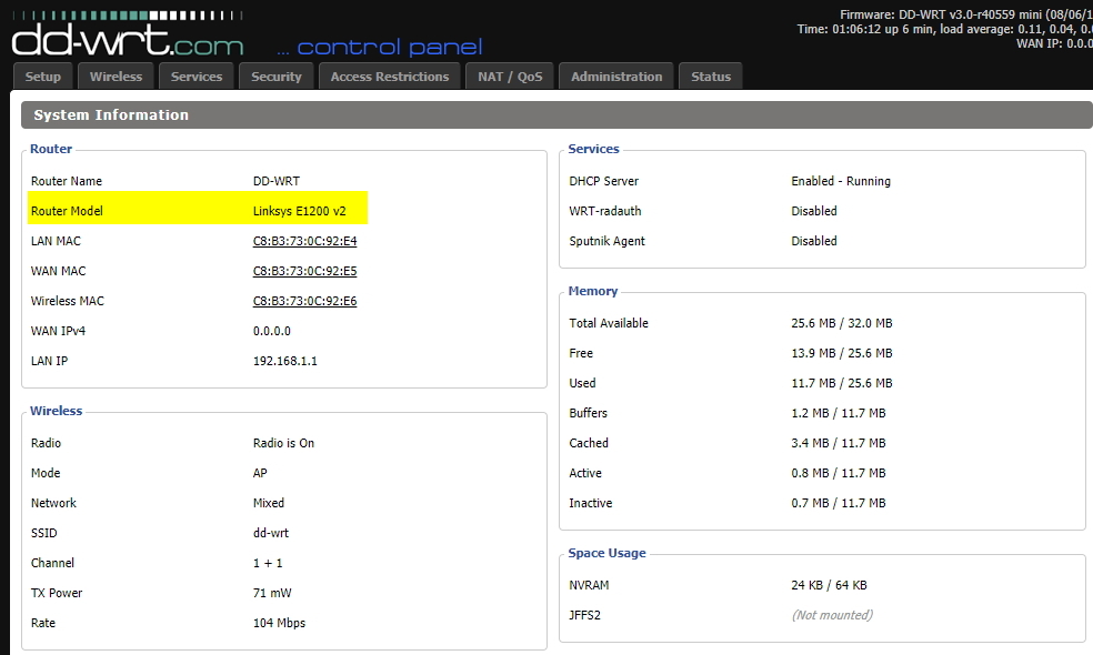 DD-WRT 펌웨어로 업그레이드 한 상태인 LINKSYS E1200 V2 유무선공유기를 가지고 간략히 기본 설정방법을 알아보자.
