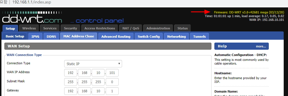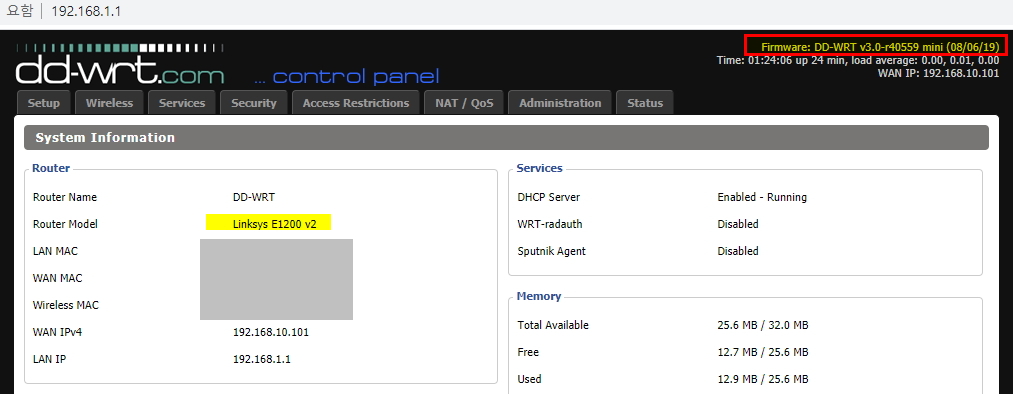 1. 현재 dd-wrt 버전 v3.0-r40559 mini 로 2019년 8월 6일 발표작이다.