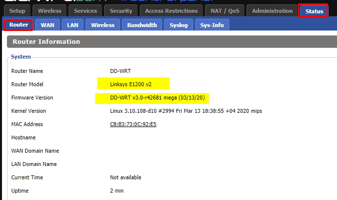 기존 LINKSYS E1200 유무선공유기로 DD-WRT V3.0r40559 mini 버전까지는 펌웨어 설치가 된 상태이다.