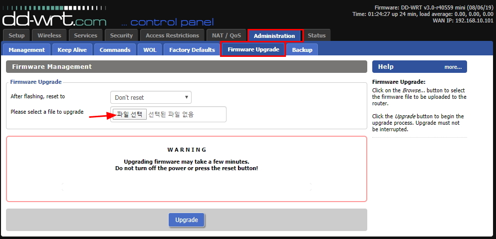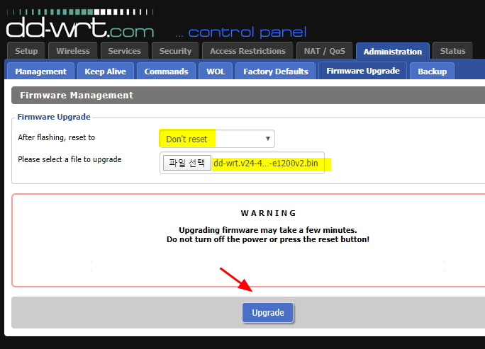 8. Administration - Firmware Upgrade 메뉴로 들어가서 파일 선택을 다운받은 펌웨어로 해 준다.