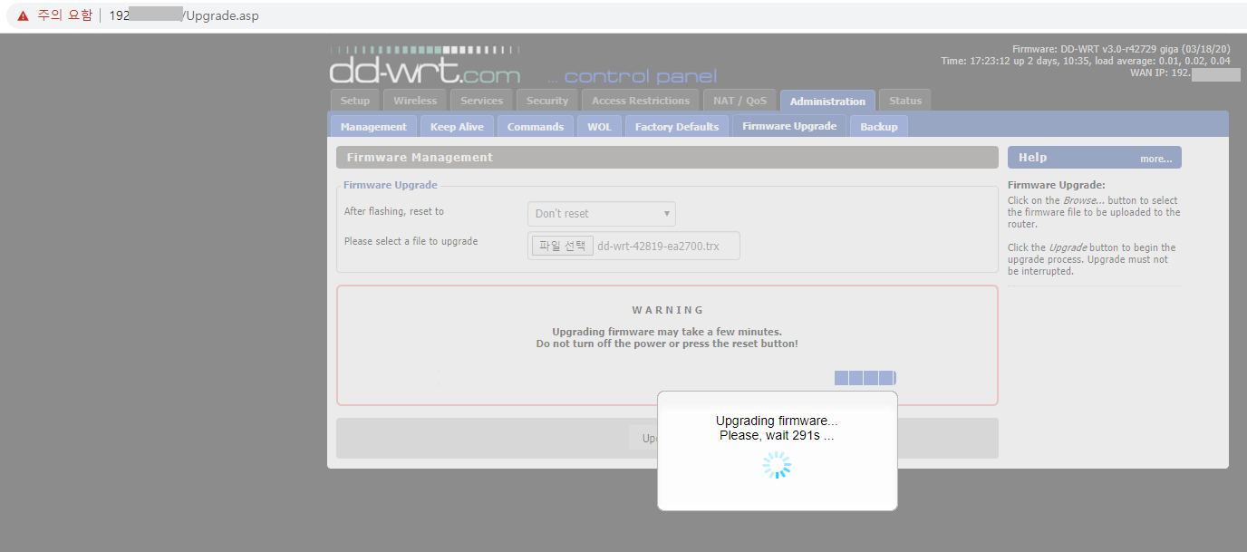 가끔씩 DD-WRT 펌웨어를 업데이트/업그레이드시 문제가 있을 수도 있으니 천천히 과정을 기다리면 별 문제가 없을 것이다.