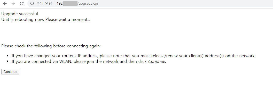 3. 10초 정도 더 있으면 다행히 아래와 같이 메세지가 나온다. CONTINUE 버튼을 누르고 계속 진행해도 정상적으로 업데이트가 완료가 되었다.