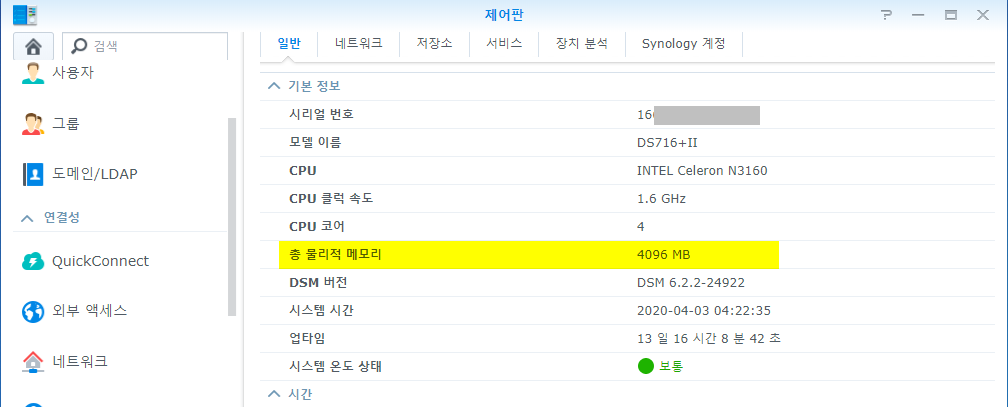 6. 시놀로지 NAS 로그인해서 제어판의 메모리 항목을 보면 4G로 표시가 된다.