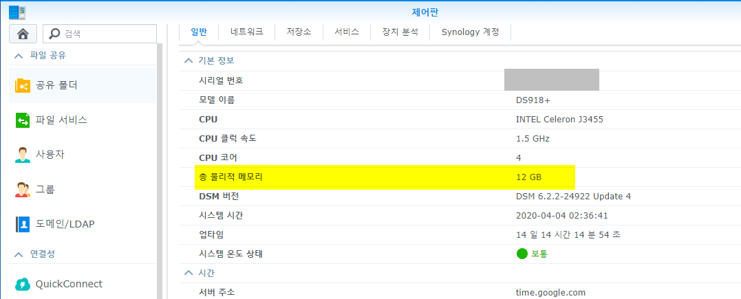 12. 시놀로지 NAS 제어판을 살펴보면 메모리가 12G로 나옴을 확인 할 수 있다.