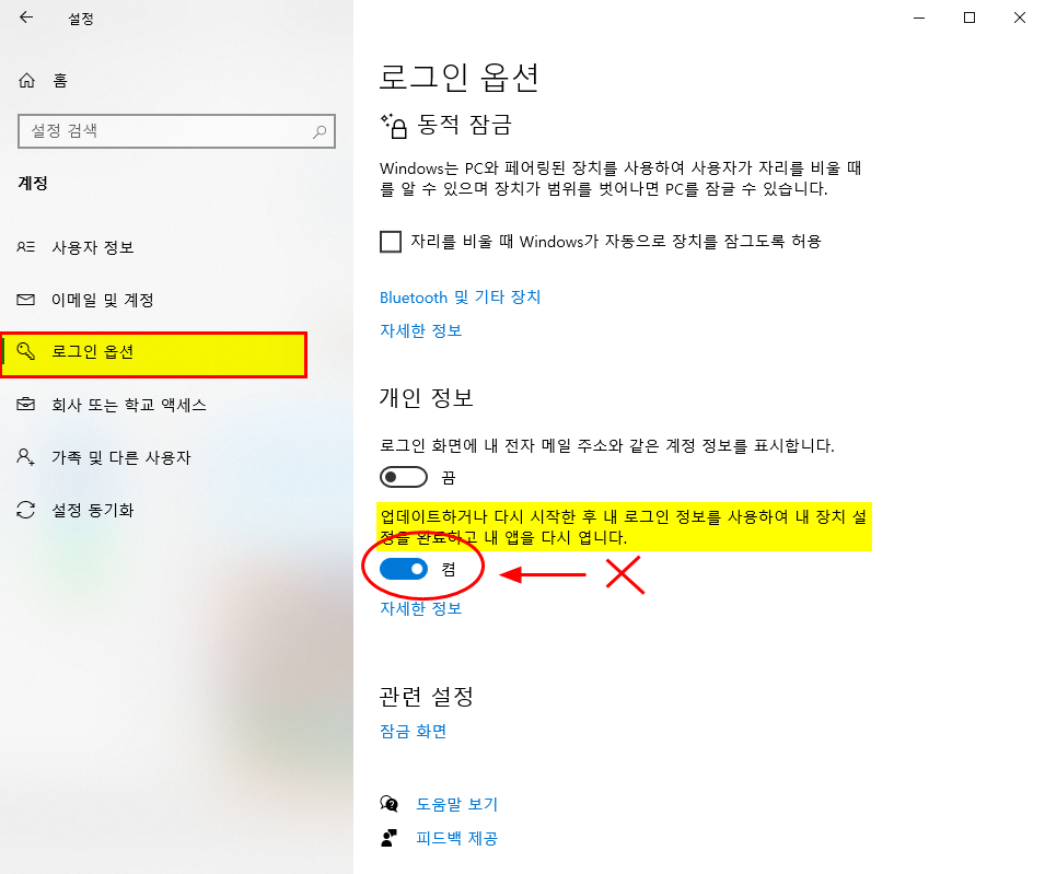 3. 로그인 옵션에서 오른편에 조금 내려보면 /개인정보/ 항목에서 "업데이트하거나 다시 시작한 후 내 로그인 정보를 사용하여 내 장치 설정을 완료하고 내 앱을 다시 엽니다." 라고 표시된 것이다.
