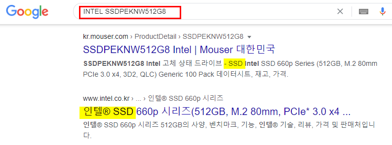 똘82닷컴의 경우는 INTEL SSDPEKNW512G8 로 나와 있는데.. 대충 앞에 SSD 가 붙은 것으로 봐서 SSD 임을 알 수 있다.