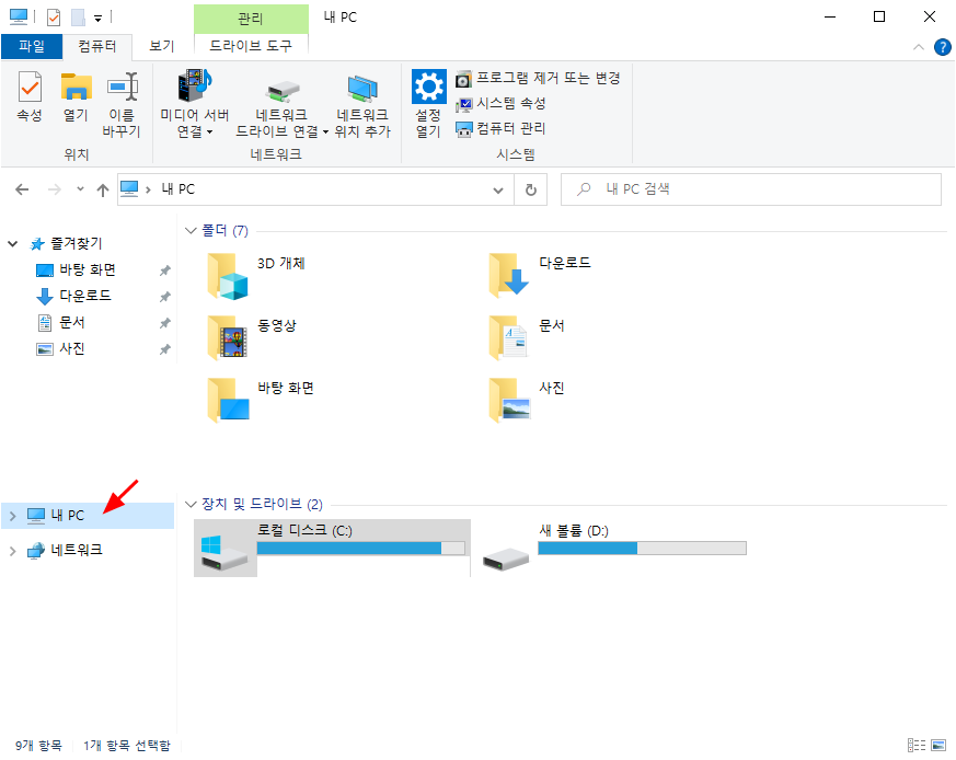 1. 아무 폴더나 하나 클릭하면 [ 내 PC ] 또는 [ 내 컴퓨터 ] 가 보일 것이다. 해당 위에서 마우스 오른쪽 클릭해서 [속성]을 선택한다.
