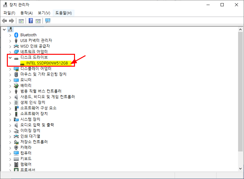 3. 여러 항목 중에 디스크 드라이브를 선택하면, 연결되어서 SSD 또는 HDD 라는 것이 나올 것이다.