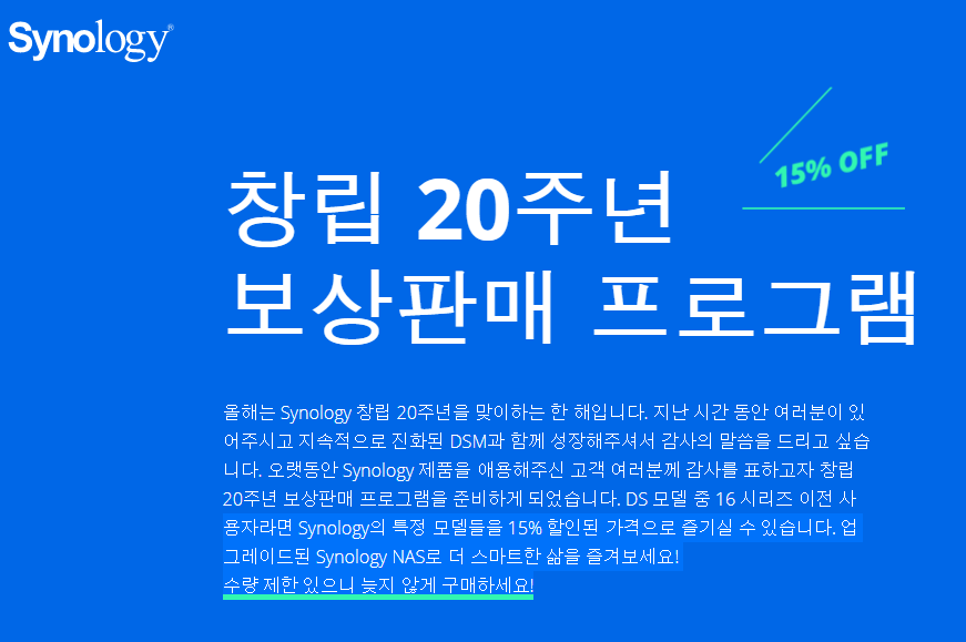 NAS로 유명한 시놀로지에서 20주년을 맞이하여, 이전 모델 사용자에 한하여 일부 모델에 대하여 10만원 정도의 할인가로 구매할 수 있는 보상판매 이벤트를 진행 중이다.