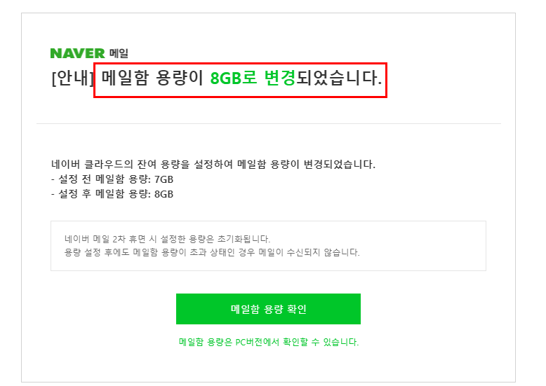 5. 답장 메일이 와 있는데 확인하면 메일 용량이 7G -> 8GB로 변경되었다고 나온다.