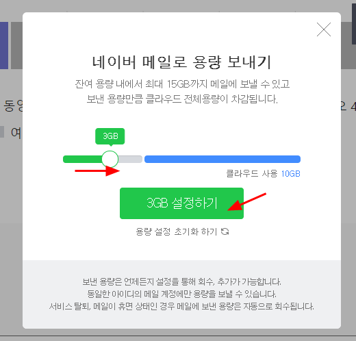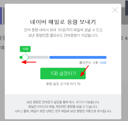 3. 네이버 메일로 용량 보내기 창이 뜨면서... 왼쪽 용량 표시된 부분을 줄였다 늘였다 할 수 있다.