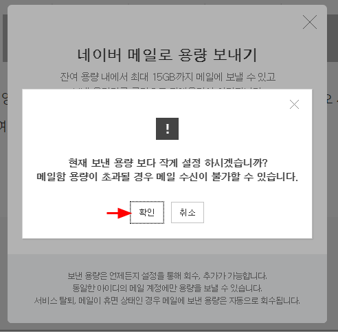 7. 메일 용량을 줄이니 '현재 보낸 용량보다 작게 설정 하시겠습니까? 메일함 용량이 초과될 경우 메일 수신이 불가할 수 있습니다' 라고 메세지가 나오는데 무시하고 [확인]하면 메일 용량이 줄어든 것도 확인 가능하다.