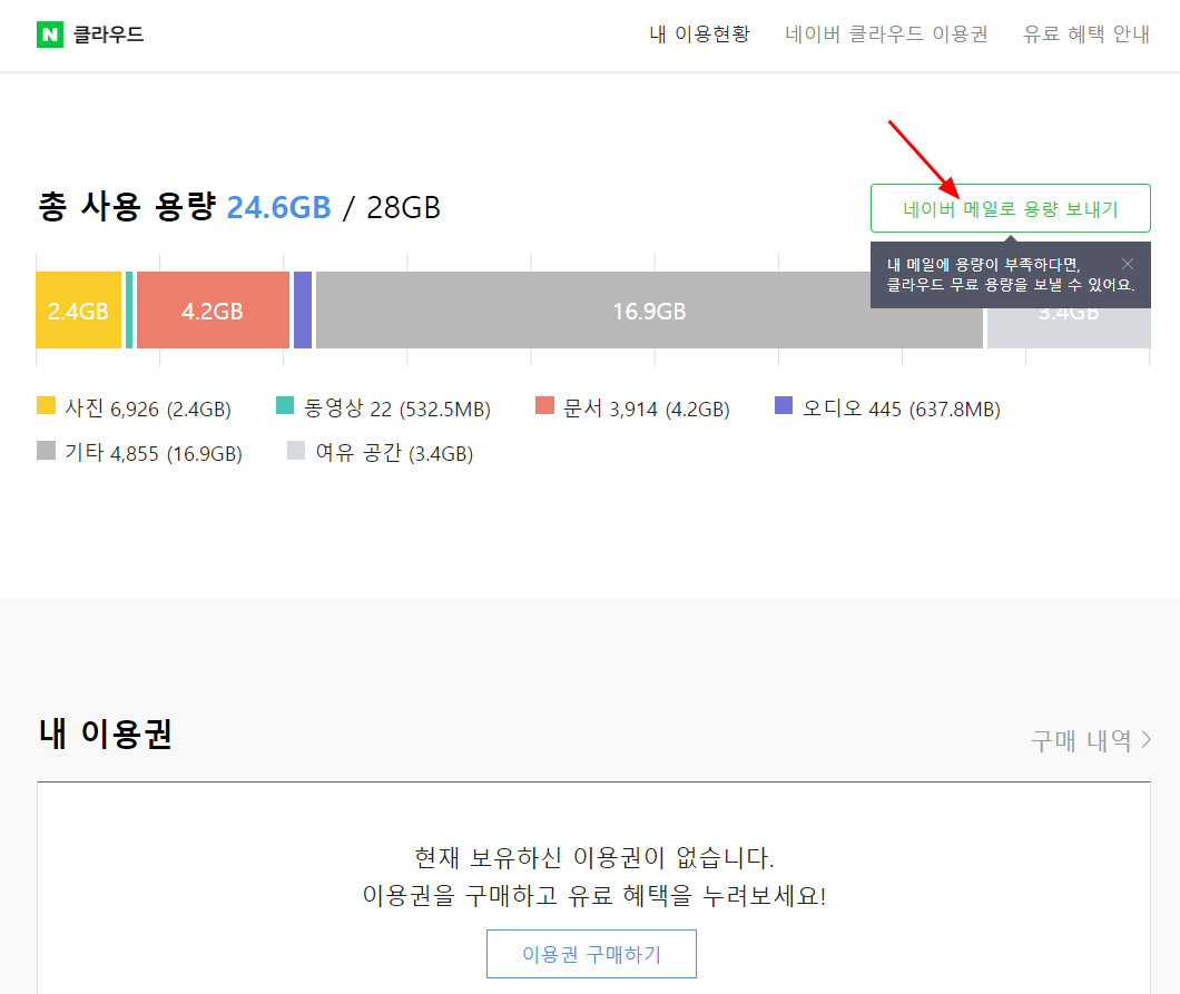 네이버 메일 용량이 부족하다면, 남는 네이버 클라우드 용량을 활용하여 메일 용량을 늘여주면 된다.