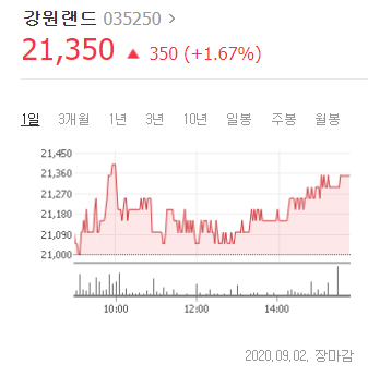 9/2일 현재 강원랜드 1주 가격이 21,350원 이다. 보통 2만원 ~ 3만원 사이를 왔다갔다 하나..최근 코로나 여파로 하락된 추세이다.