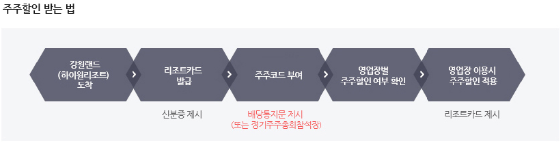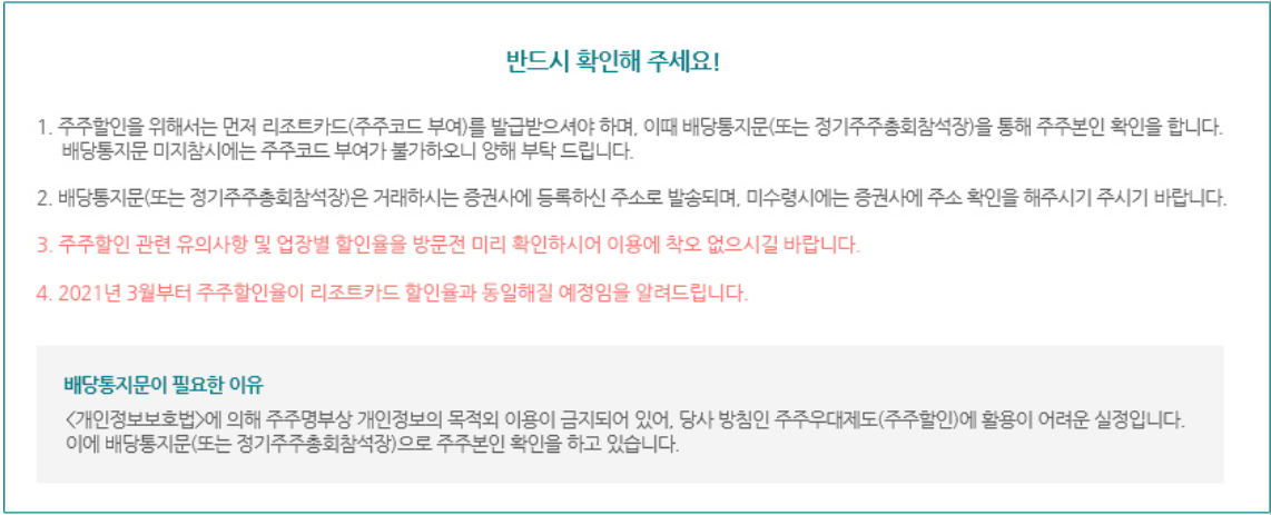 1. 주주할인을 위해서는 먼저 리조트카드(주주코드 부여)를 발급받으셔야 하며, 이때 배당통지문(또는 정기주주총회참석장)을 통해 주주본인 확인을 합니다. | 배당통지문 미지참시에는 주주코드 부여가 불가하오니 양해 부탁 드립니다. 2. 배당통지문(또는 정기주주총회참석장)은 거래하시는 증권사에 등록하신 주소로 발송되며, 미수령시에는 증권사에 주소 확인을 해주시기 주시기 바랍니다.