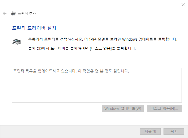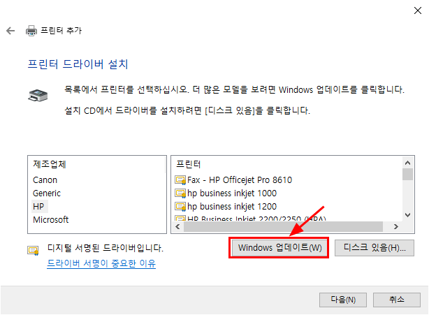 6. 프린터 드라이버 설치 창에서 [Windows 업데이트]를 선택하면 윈도우에서 자동으로 프린터 드라이버 리스트를 불러온다.