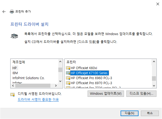 9. 여기서는 제조업체 [HP] - HP Officejet K7100 Series 를 선택해 보았다.
