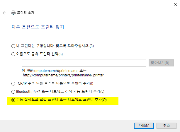 3. 수동 설정으로 로컬 프린터 또는 네트워크 프린터 추가 선택