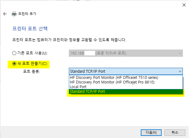 5. 프린터의 IP 주소를 알고 있다면 아래에 [ 새포트 만들기 ] - [STANDARD TCP/IP PORT ] 를 선택해서 IP주소를 입력해 주면 된다.