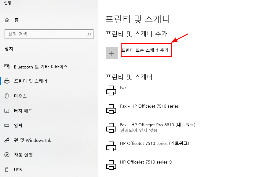 1. 설정에서 [프린터 및 스캐너] - [ 프린터 또는 스캐너 추가 ] 를 선택