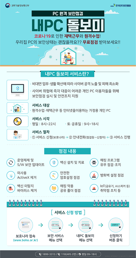 코로나 19 확산으로 원격교육, 재택근무 등 비대면 서비스 이용이 가속화됨에 따라 PC 이용자의 사이버 공격 노출 가능성이 높아졌습니다.