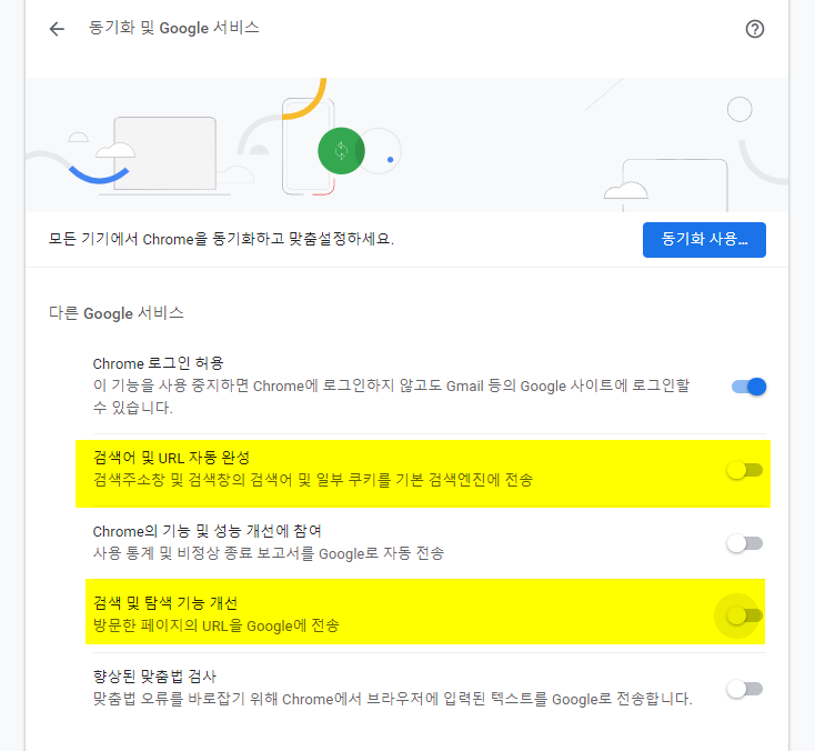 3. 검색어 및 URL 자동 완성을 해제 해 준다.