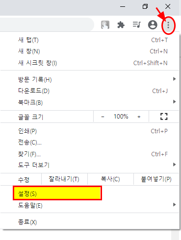 1. 구글 웹브라우저 오른쪽 상단에 [...]을 눌러 [설정]을 선택한다.