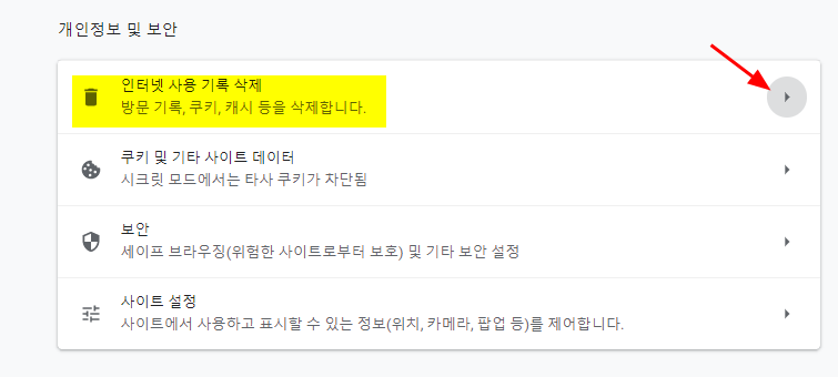 위의 화면에서 빠져 나와서, 개인정보 및 보안 항목 중에 [인터넷사용 기록 삭제] 를 선택한다.