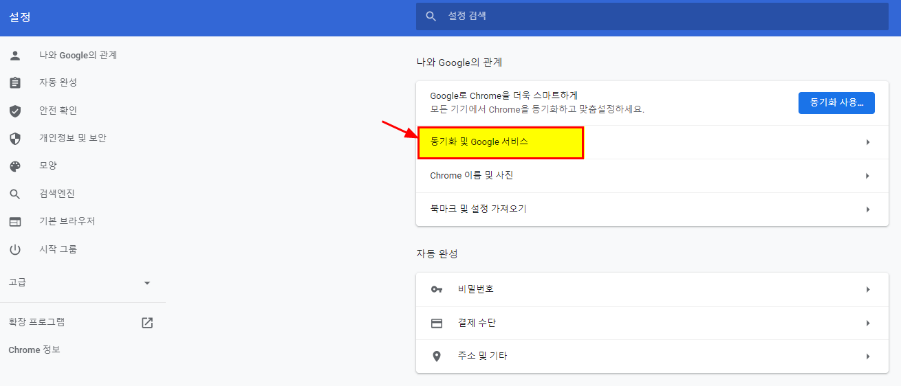 2. 중간에 [동기화 및 Google 서비스]를 클릭한다.