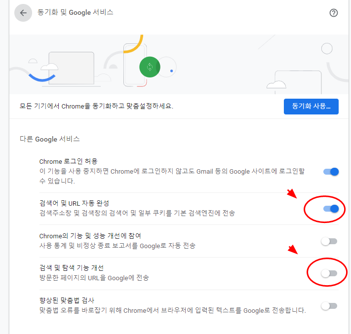 그리고 검색 및 탐색 기능 개선 도 해제 해 준다.